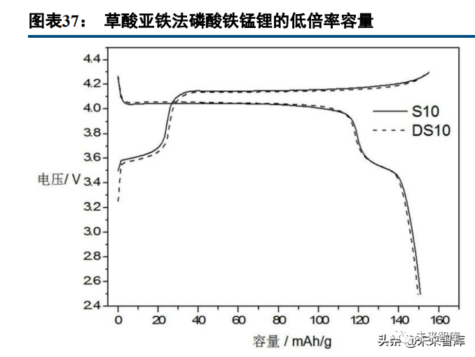 公开于 2015 年的专利 CN104681795A 则以硫酸亚铁、硫酸锰、磷酸铵为原料,液相法制备了不同类型的前 驱体-片状磷酸亚铁锰铵,后续再和锂源、磷源液相复合、烘干煅烧获得磷酸铁锰锂。实施例的铁锰比为 6:4。所得磷酸铁锰锂 0.2C 下容量超过 150mAh/g,1C 下超过 140mAh/g。
