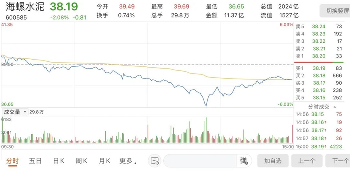 公司表示,预计到2022年底,光伏发电装机容量可达1GW,年发电能力10亿度。截至3月9日收盘,海螺水泥报38.19元/股,跌幅2.08%,总市值2024亿元。