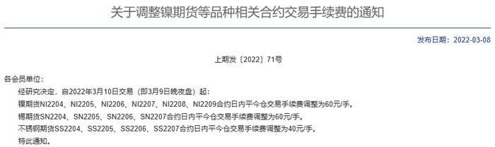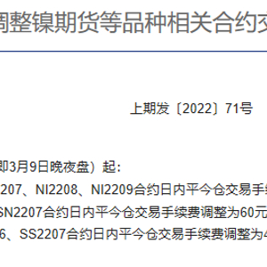 上期所8日晚公告,自2022年3月10日交易(即3月9日晚夜盘)起,将镍期货NI2204、NI2205、NI2206、NI2207、NI2208、NI2209合约日内平今仓交易手续费调整为60元/手。