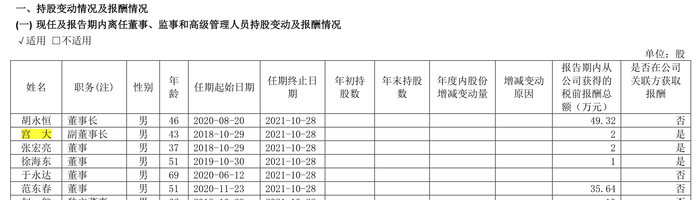 与此同时,在2020年年报中可以看到,曙光股份该年给宫大的税前报酬总额为2万元。而回避投票的张宏亮也为2万元,徐海东为1万元,于永达的报酬没有显示。