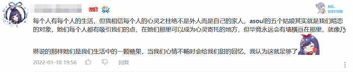例如国内人气高涨的虚拟女团A-SOUL,在B站、贴吧、微博等平台,常有粉丝真情实感讲述自己“被圈粉”的心路历程。其中,“快乐”、“包容”都是常见的字眼,有人表示“被五个人的努力和真诚打动”,有人告诫自己“抛下成见”,还有感谢偶像给予自己“做出改变”的动力。