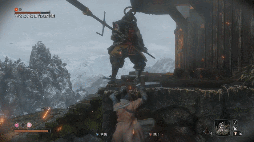 与之类似的还有《只狼》里的精英敌人“苇名七本枪”,玩家同样可以利用卡地形的方式,将他“修脚”至死。