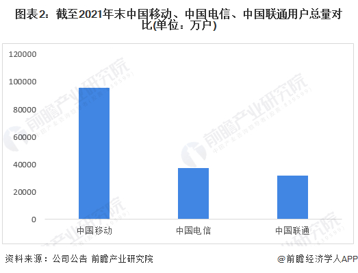 中国移动、中国电信、中国联通2021年运营数据显示,截至2021年末,中国移动用户总数达到95689万户;中国电信用户总数达到37243万户;中国联通移动出账用户累计达31712万户。