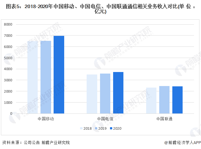 从通信业务的经营情况来看,2018-2020年,中国移动的通信业务收入均领先于中国电信和中国联通,2020年,中国移动的通信业务实现收入6956.92亿元,中国电信和中国联通的通信业务分别实现收入3737.98和2443.36亿元。