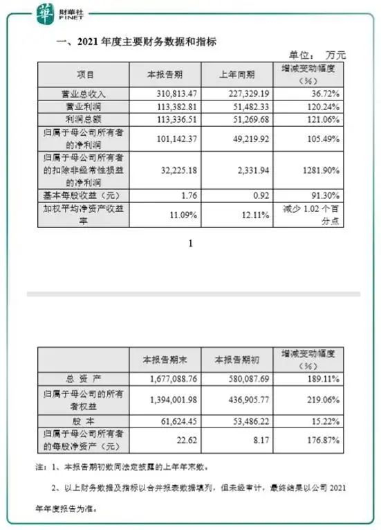 2月24日,中微公司(688012.SH)公告发布2021年度业绩快报。报告期内(2021年全年),公司实现营业总收入31.08亿元,同比增长36.72%;同期实现归母净利润10.11亿元,同比增长105.49%;实现归母扣非净利润3.22亿元,同比增长1281.90%。各项财务数据见下表。