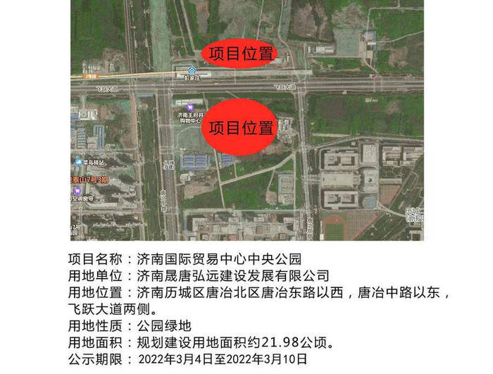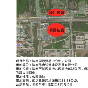 根据公示信息,飞跃大道从济南国际贸易中心中央公园项目中间穿过,将公园分为南、北两区,公园西临唐冶中路,东临唐冶东路,周边有已运营的地铁2号线彭家庄站和在建地铁4号线,交通便利。今年2月,该项目发布招标信息,主要建设广场、水景、停车场、雕塑小品、绿地、跑道、儿童游乐场、老人健身场地、配套建筑及停车场、绿化等。