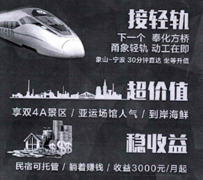 当事人在微信朋友圈发布“石浦昌庭嘉园项目”房产广告,包含“……民宿全托管/躺着赚钱/收益3000元/月起……”“……扣除装修、还贷、托管费用和税费,保守收益5%左右……”等内容。当事人还制作了“石浦昌庭嘉园项目”的纸质宣传单页,包含“……接轻轨,下一个奉化方桥,甬象轻轨 规划2021年建设……”等内容,该宣传内容与实际不符。