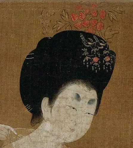 画中的女人还梳着唐时流行的一种发髻样式——高髻。这种发髻,鬓角蓬松,整体高耸,形似陡峭的山峰,常常需要鲜花钗簪等头饰加以固定。