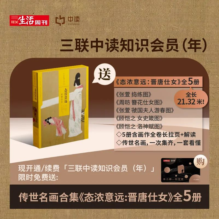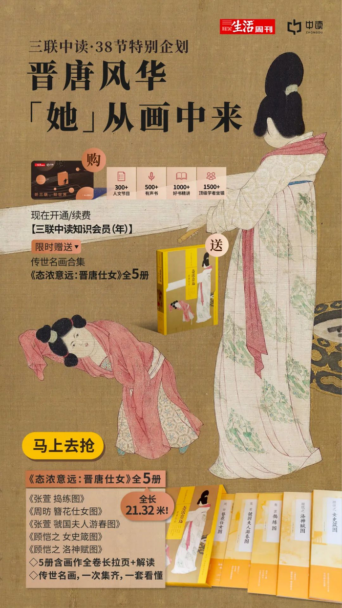回顾一下,现在开通或续费「三联中读·知识年卡」,不仅能畅享年会员权益,还可免费获赠《态浓意远:晋唐仕女》全5册,数量不多,莫失良机。