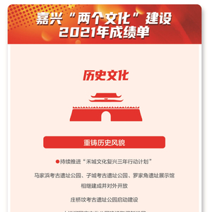 文变染乎世情,兴废系乎时序。文化兴则发展兴,文化强则根基稳。嘉兴打造共同富裕典范城市,文化建设是筑底工程。在文化建设中,嘉兴一直在努力,通过爱国主义教育、革命传统教育、培养人民群众爱党爱国情操;通过历史文化遗产的保护、挖掘、展示,把优秀中华传统文化发扬光大,让“两个文化”的精神内涵内化到嘉兴人的血脉之中,成为更基本、更深沉、更持久的力量,成为激励嘉兴人民不懈奋斗的文化自信和精神动力。