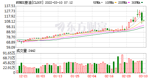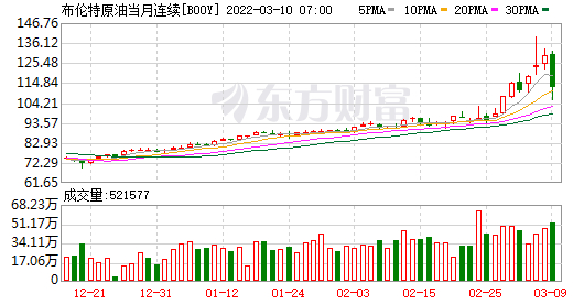 截至收盘,纽约商品交易所4月交货的轻质原油期货价格比上一日下跌15.00美元,报每桶108.70美元,跌幅12.12%;5月交货的伦敦布伦特原油期货价格比上一日下跌16.84美元,报每桶111.14美元,跌幅为13.16%。