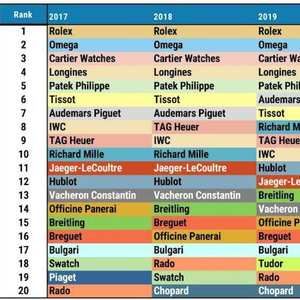 据报告统计,排行榜前五的品牌已经占据了整个制表业53%的市场份额,前25个品牌占据了90%的份额。