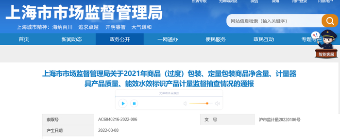 上海市市场监督管理局通报2021年定量包装商品净含量计量监督抽查情况
