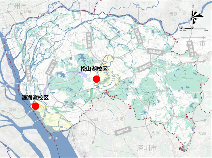为贯彻高起点谋划、高格局定位、高水平建设的要求,大湾区大学按照“一校两区”的思路在东莞滨海湾新区和松山湖高新区规划建设,总占地约2356亩,包括松山湖校区256亩、滨海湾校区2100亩。
