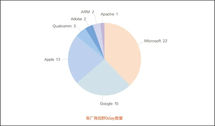 从在野0-day漏洞涉及厂商的分布情况来看,2021年被披露最多的厂商是微软,其次是谷歌和苹果。