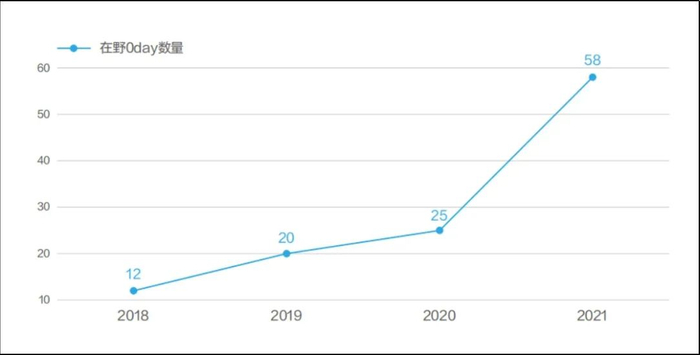 从2018年到2021年披露的在野0-day漏洞数量变化趋势来看,近年来在野0-day漏洞数量逐年增多。2021年的增长趋势最为明显,2021全年披露数量超过2020年全年披露数量的两倍。