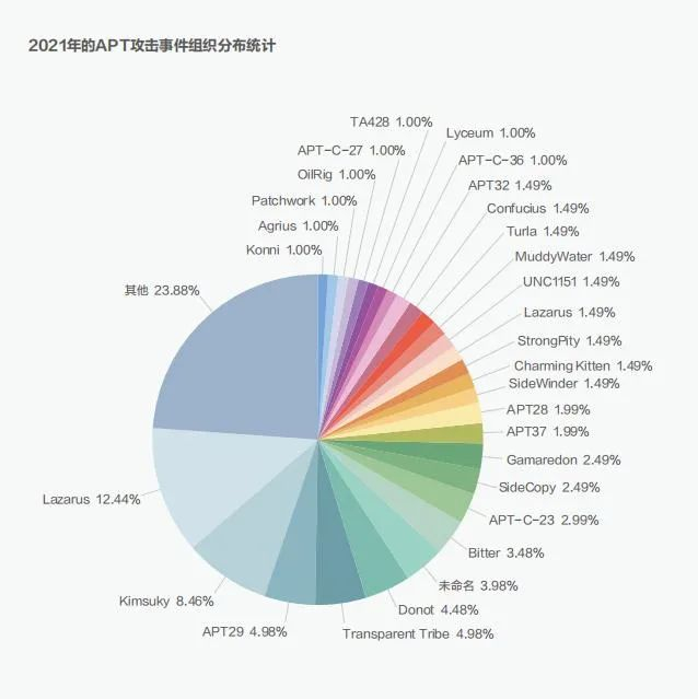 Lazarus组织是2021年全球APT攻击数量最多的APT组织。根据安恒信息发布的《2021高级威胁态势研究报告》,Lazarus组织、Kimsuky组织以及APT29组织的攻击数量位列前三,这几个组织的攻击受地缘政治因素影响,体现出高度针对性和复杂性。