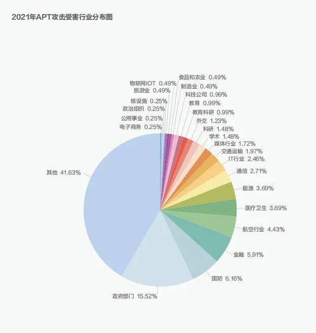 那么,哪些行业受APT攻击影响较大呢?安恒信息发布的《2021高级威胁态势研究报告》显示,2021年,政府、国防、金融、航空、医疗卫生部门受APT攻击比例分别为15.52%、6.16%、5.91%、4.43%和3.69%,排名靠前。