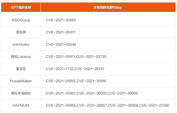 安恒猎影实验室梳理了2021年在野0-day漏洞和具体使用它们的APT组织关联情况,如下:
