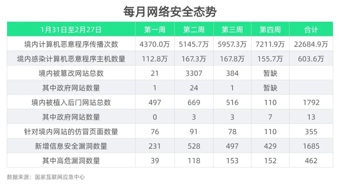 从仿冒网站、漏洞数量来看,2月较1月都有明显下降。其中,仿冒网站从1月的460个到2月的355个,仿冒网站数量下降也归功于全国反诈工作较为成功。而漏洞数量从1月的2045个到2月的1685个,环比下降21.36%,其中高危漏洞也有明显减少。针对安全漏洞问题,一定要在正规途径下载应用,并即时更新,不可心存侥幸。