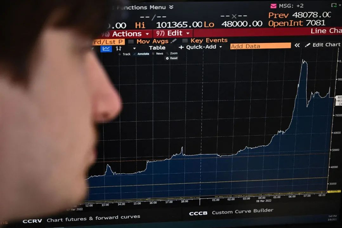 ▲当地时间2022年3月8日,英国伦敦,屏幕上显示的是镍价一天的涨跌走势。伦敦金属交易所(LME)暂停镍交易,至少于当日剩余时间内不会恢复交易。停盘前,镍价报80000美元/吨。图/视觉中国