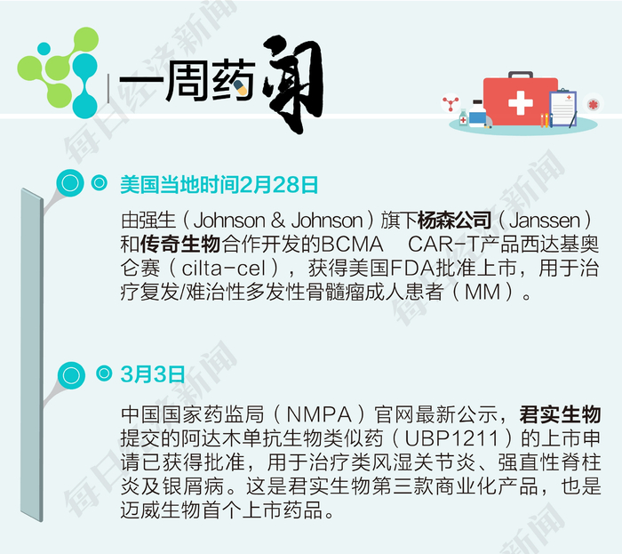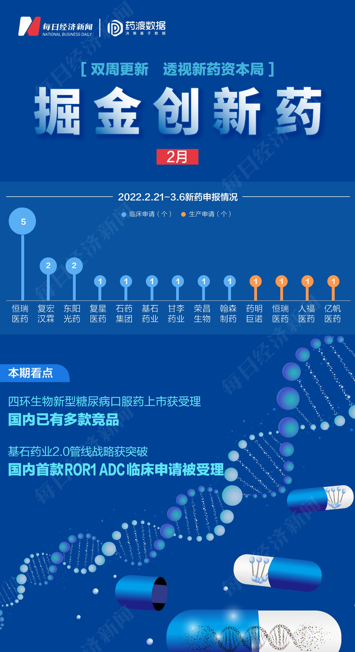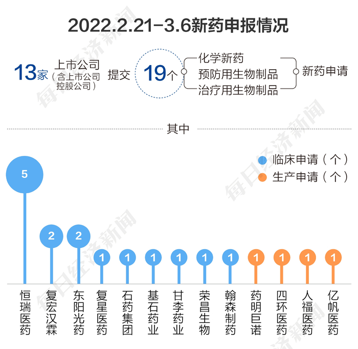2022年2月21日至3月6日期间,恒瑞医药(600276.SZ)申报5个临床申请,复宏汉霖(02696.HK)和东阳光药(01558.HK)各申报2个临床申请,复星医药(600196.SH)、石药集团(01093.HK)、基石药业(02616.HK)、甘李药业(603087.SH)、荣昌生物(09995.HK)、翰森制药(03692.HK)各申报1个临床申请。药明巨诺(02126.HK)、四环医药(00460.HK)、人福医药(600079.SH)、亿帆医药(002019.SZ)各申报一个生产申请。