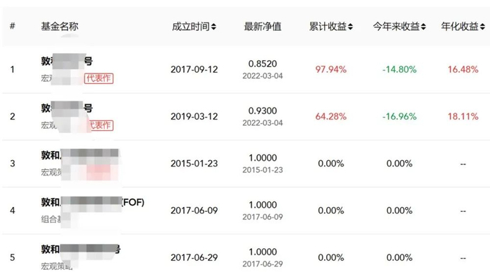 私募排排网数据也显示,目前敦和资管旗下公布业绩数据的两只产品,截至3月4日,今年以来跌幅达到14.80%、16.96%。
