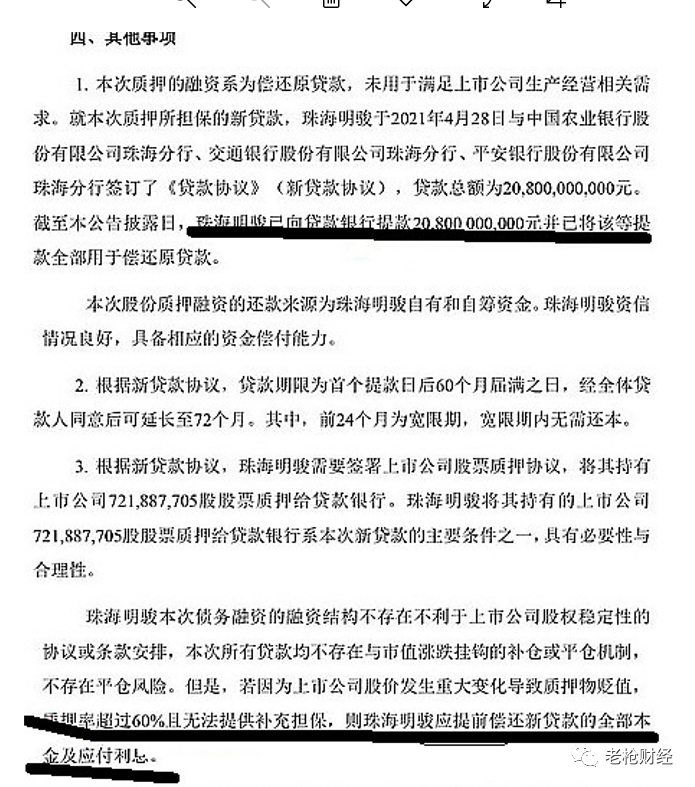 2019 年 12 月,珠海明骏与招商银行等七家银行签订贷款协议,贷款总额约为 208亿元,融资系用于珠海明骏受让格力集团所持格力电器 15% 的股份,同时珠海明骏将其所持格力电器股票也质押给贷款银行,作为贷款的主要条件之一。