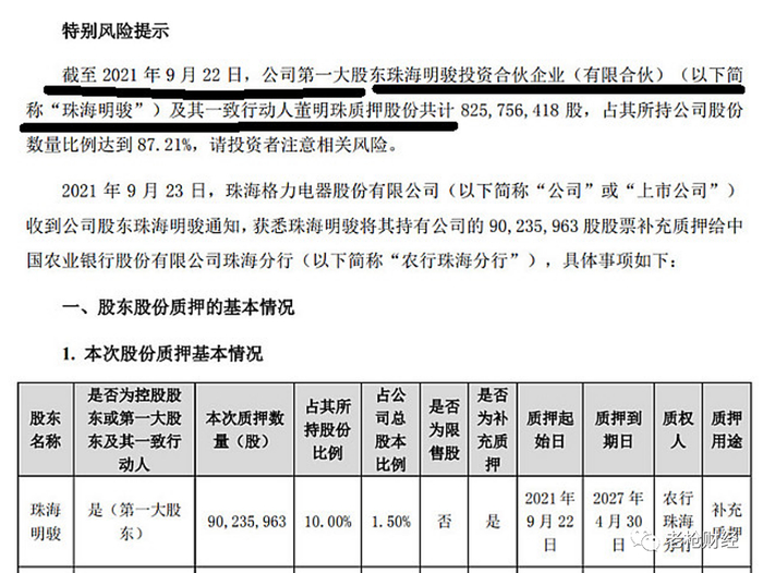 就算加上董明珠,珠海明骏和董明珠合计也只持有格力电器9.46亿股 。由此推测,在2021年9月23日这次新增质押后, 珠海明骏手里可能已经没剩多少股份可供新增质押的了,一旦珠海明骏可供质押的股份趋于枯竭,引发连锁 反应,这将是一件危险的事情。