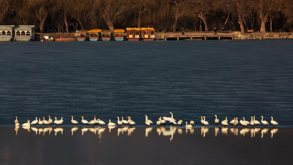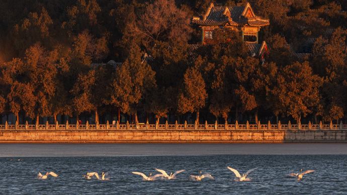 颐和园昆明湖已迎来了好几批路过北京的迁徙天鹅。
