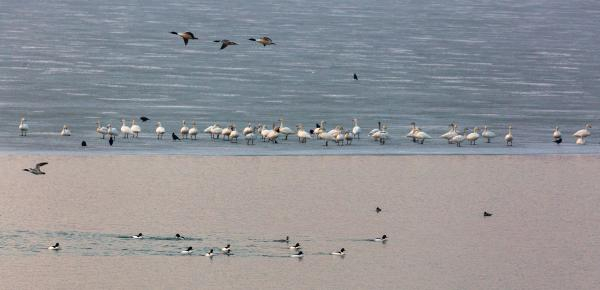 “海陆空”三军:水里游的,冰上走的,空中飞的天鹅。 张晓莲 摄。