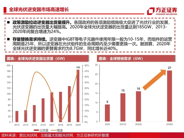 IGBT使用周期短于光伏组件,存量替换需求持续。逆变器中IGBT等电子元器件使用年限一般为10-15年,而组件的运营周期是25年,所以逆变器在组件的生命周期内至少需要更换一次,2020年全球光伏逆变器的更替需求达8.7GW,同比增长近40%。