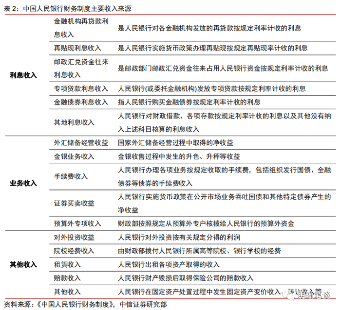 我国央行的财务收入主要包括利息收入、业务收入和其他收入。《中国人民银行财务制度》提到了三方面的财务收入:①利息收入,指以资产形式形成的各类资金按国家规定的利率计收或形成的利息;②业务收入,指人民银行在行使中央银行职能,办理业务过程中所发生的除利息收入以外的相关收入;③其他收入,指与人民银行业务活动没有直接关系的收入。同时,《中国人民银行财务制度》还提到了六方面的财务支出,即利息支出、业务支出、管理费支出、事业费支出、固定资产构建支出、其他支出。人民银行全行利润等于各项收入减去各项支出。