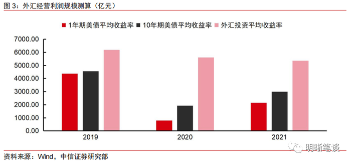 根据外汇储备资产,结合不同情景假设下的收益率和当年平均汇率,预计2020-2021年合计收益可达5000-10000亿元。我们以年初数和年末数的平均值代表当年的外汇储备资产;收益率方面则模拟了三种场景:①根据国际收支平衡表和国际投资头寸表取得每年的对外投资收益(包含外汇储备投资和私人部门对外投资的回报),再结合当年对外金融资产计算收益率,其中2021年由于数据尚未更新,我们以2020年来代替;②考虑到外汇储备投资的风险偏好可能不及私人部门,相应收益率会有降低,我们再以当年美债的1年期收益率和10年期收益率进行了计算。最终我们将计算得到的美元收益乘以当年平均汇率转换为人民币计价规模。从结果来看,2020-2021年留存下来的外汇经营利润可能在5000-10000亿元之间。