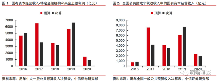 银行上缴利润计入国有资本经营收入,且这一科目每年数字波动较大。根据《2021年政府收支分类科目》来看,中国人民银行上缴收入的科目代码为103060101,其中103表示非税收入,06表示当中的国有资本经营收入,随后两个01分别表示利润收入以及中国人民银行上缴收入。因此,银行上缴利润纳入非税收入项目下国有资本经营收入。虽然我们难以直接得到央行历年上缴情况,但从整体来看,这一科目数字变动较大,具备较高的弹性,根据实际经济及财政情况灵活调整、统筹调度。2020年受疫情影响,特定国有金融机构和专营机构暂停上缴利润,这一科目也明显下滑。