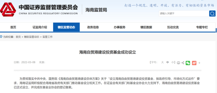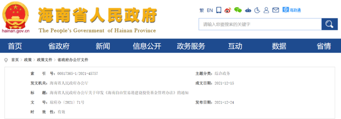 2021年12月,海南省政府办公厅印发《海南自由贸易港建设投资基金管理办法》,针对管理架构与职责、投资范围与基金运营、风险控制与监督管理、绩效评价等方面作出具体安排。指出自贸港基金是指由省政府出资设立、按市场化方式运作的省级政府投资基金母基金,基金规模为100亿元,拉开了海南自由贸易港建设投资基金的序幕。