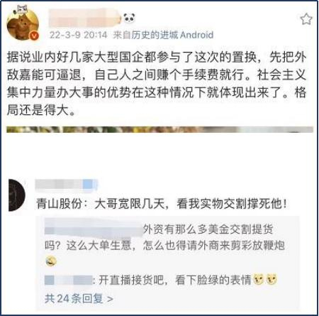消息一出,网友也开始热议,有人称这是一方有难八方支援,“业内好几家大型国企都参与了这次的置换,先把外敌嘉能可逼退”。