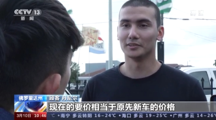 顾客 丹尼尔:这辆车是2013年的,二手车商要价1.9万美元,还要再加上其他税费。两三年前只要1.4万美元或1.5万美元,现在的要价相当于原先新车的价格。