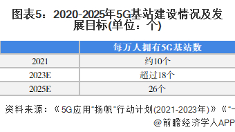 截至2021年,我国每万人拥有5G基站数约10个。根据《5G应用“扬帆”行动计划(2021-2023年)》,到2023年,我国5G网络覆盖水平不断提升,每万人拥有5G基站数超过18个,建成超过3000个5G行业虚拟专网。此外,根据《“十四五”时期信息通信行业发展规划》,至2025年,我国每万人拥有5G基站数达26个。