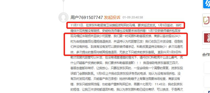 科勒马桶多次“开箱即碎”,售后态度也恶劣