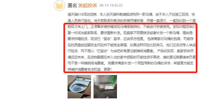另一位消费者情况也是类似。即在官方旗舰店购买马桶,安装时拆箱发现马桶破碎,并及时向科勒客服反馈,但对方一般以“已签收”为由把责任归结给消费者。