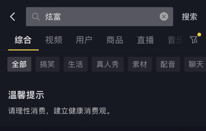 目前,用户在抖音搜索“炫富”相关单点词和组合词时,会出现温馨提示:请理性消费,建立健康消费观。