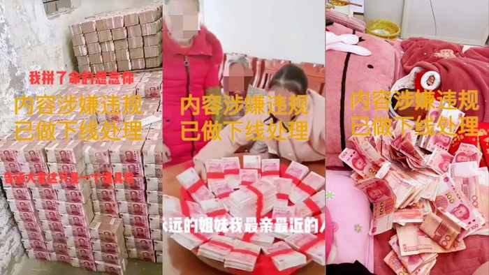 嚯!这满屏画面,不一样的场景,一样的核心,那就是争相晒“粉红”,一摞摞、一打打,掩饰不住内心晒出来的欲望。