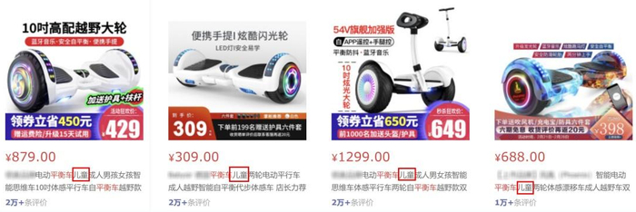 从电商网站可以发现不少产品名称打着儿童使用,其实适用年龄为12周岁甚至16周岁以上的电动平衡车。