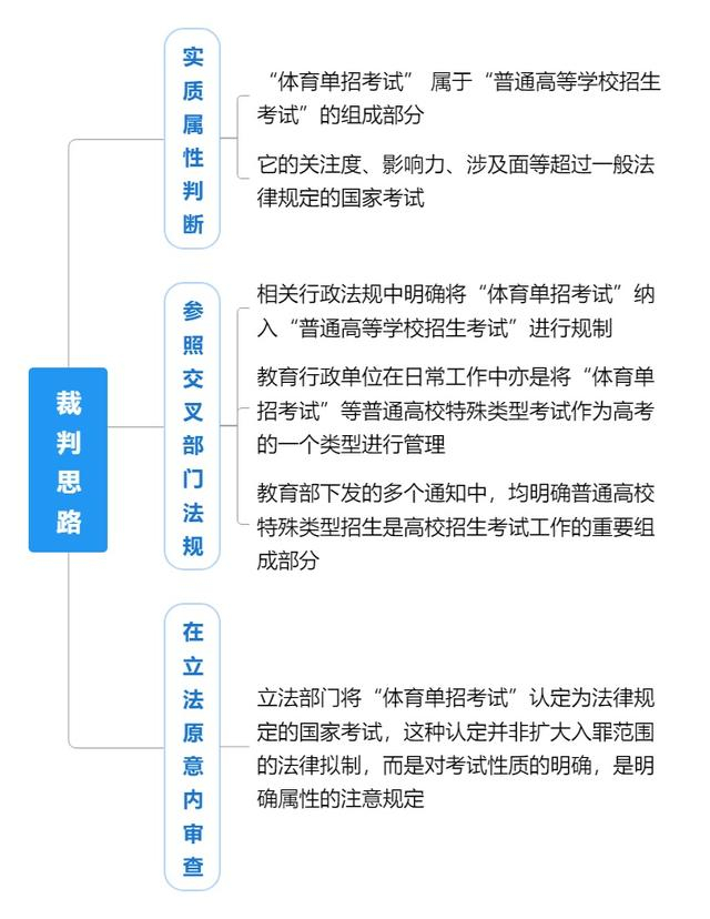 涉案“单招考试”的形式和内容虽然与普通高等学校统一招生考试有所区别,但是从关注度看,特定专业的考生及家庭对该考试的关注与参与统一高考的考生对统一高考的关注并无差别;从影响力看,其决定考生是否能够进入高校就读取得相应文凭,对考生的影响亦与统一高考一致;从涉及面看,其涉及特定专业核心招生方式,招生广度上看甚至超过一定地区的统一高考。综上分析,涉案考试性质、地位、作用以及对高校招生工作的实际功效、影响,均和统一高考没有明显差距,认定“普通高等学校运动训练、武术和民族传统体育专业招生考试”属于“普通高等学校招生考试”既符合一般语义认知,亦符合其实质属性。