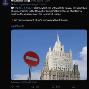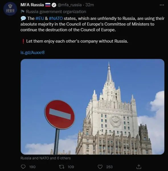 “欧盟和北约国家,那些对俄罗斯不友好的国家,正利用他们在欧洲委员会部长委员会中的绝大多数(优势),继续破坏着欧洲委员会。让他们在没有俄罗斯的情况下、享受彼此的陪伴吧。”俄外交部在推文中写道。