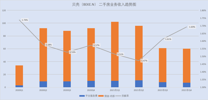 对应的收入分为两部分,一是链家门店交易额中的佣金收入,二是平台针对非链家门店交易额收取的平台服务费。