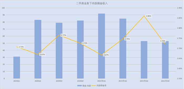 二手房业务中,贡献更大的仍然是贝壳旗下的链家门店,佣金率在三季度曾有过一个明显的提高,达到2.86%的水平,但四季度又回落至与此前相近的2.72%。