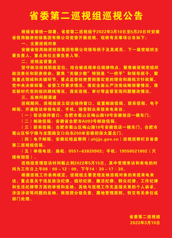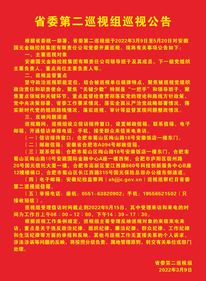 联系信箱: 安徽世纪金源大饭店主楼西侧(合肥市滨湖新区徽州大道5558号)、安徽投资大厦南门东侧(合肥市望江东路46号)设置了巡视组信箱;