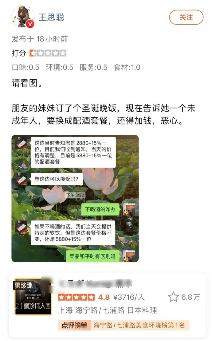 有朋友记得去年年底时的一条新闻吗?王思聪在点评网站上炮轰魔都一家高级日料店,原因是其友人预定了这家日料店的平安夜晚餐,结果临近日期了突然收到店铺的消息,表示得临时加价。
